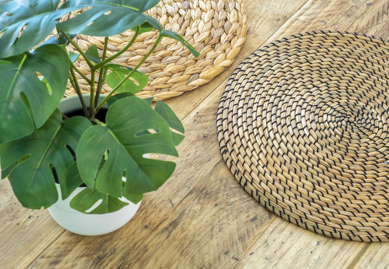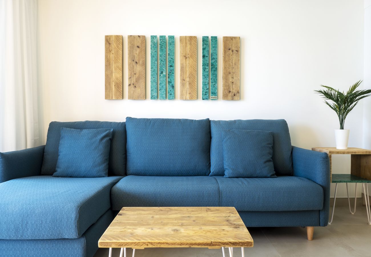 De woonkamer heeft directe toegang tot het terras waar u heerlijk kunt liggen lezen, ontbijten of lunchen met prachtig uitzicht op de zee en de Peñon de Ifach. Het interessante aan deze flat is dat er gerecycleerde materialen zijn gebruikt, zoals het massief houten meubilair dat een tweede leven heeft gekregen en de blauwe details, gerecycleerd plastic uit de Middellandse Zee dankzij het bedrijf The Gravity Wave. Het appartement is voorzien van airconditioning, verwarming en ventilatoren. Verschillende verlichting afhankelijk van de ruimte, algemeen en sfeervol-decoratief.